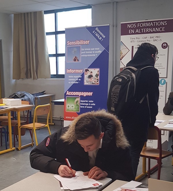 Le 19 octobre 2017, dans le cadre de la semaine de la professionnalisation du Lycée, l’AFAJE a organisé et animé, face à des jeunes de deux classes de Secondes ARCU (Accueil – relations clients et usagers) et d’une classe de seconde Gestion, une première action d’information relative à la filière, et de sensibilisation à l’entrepreneuriat…